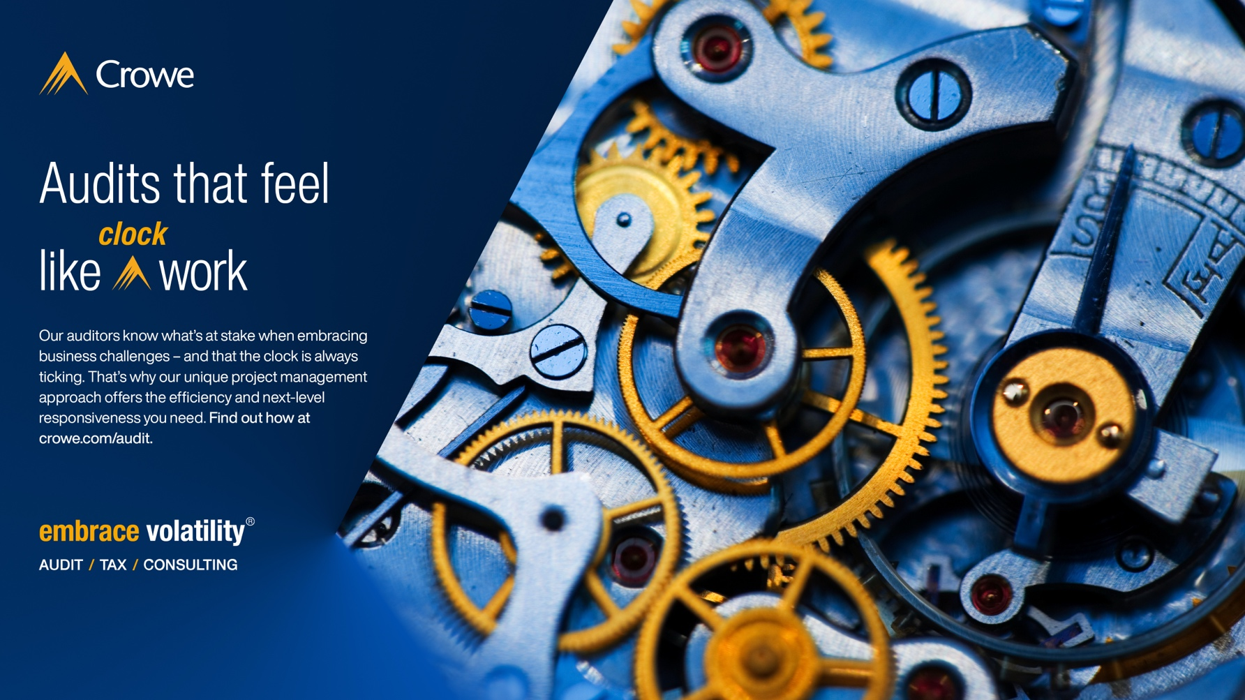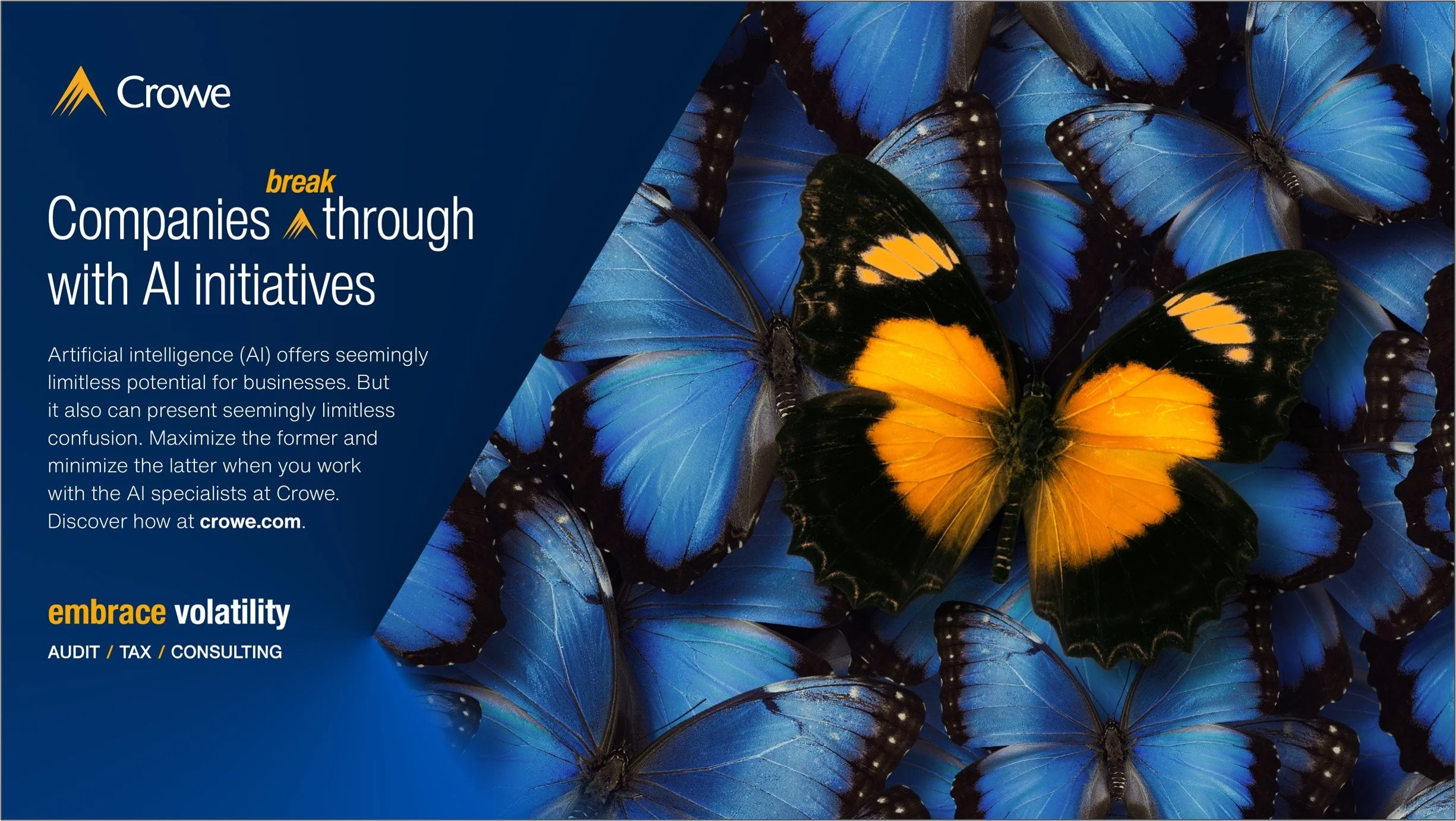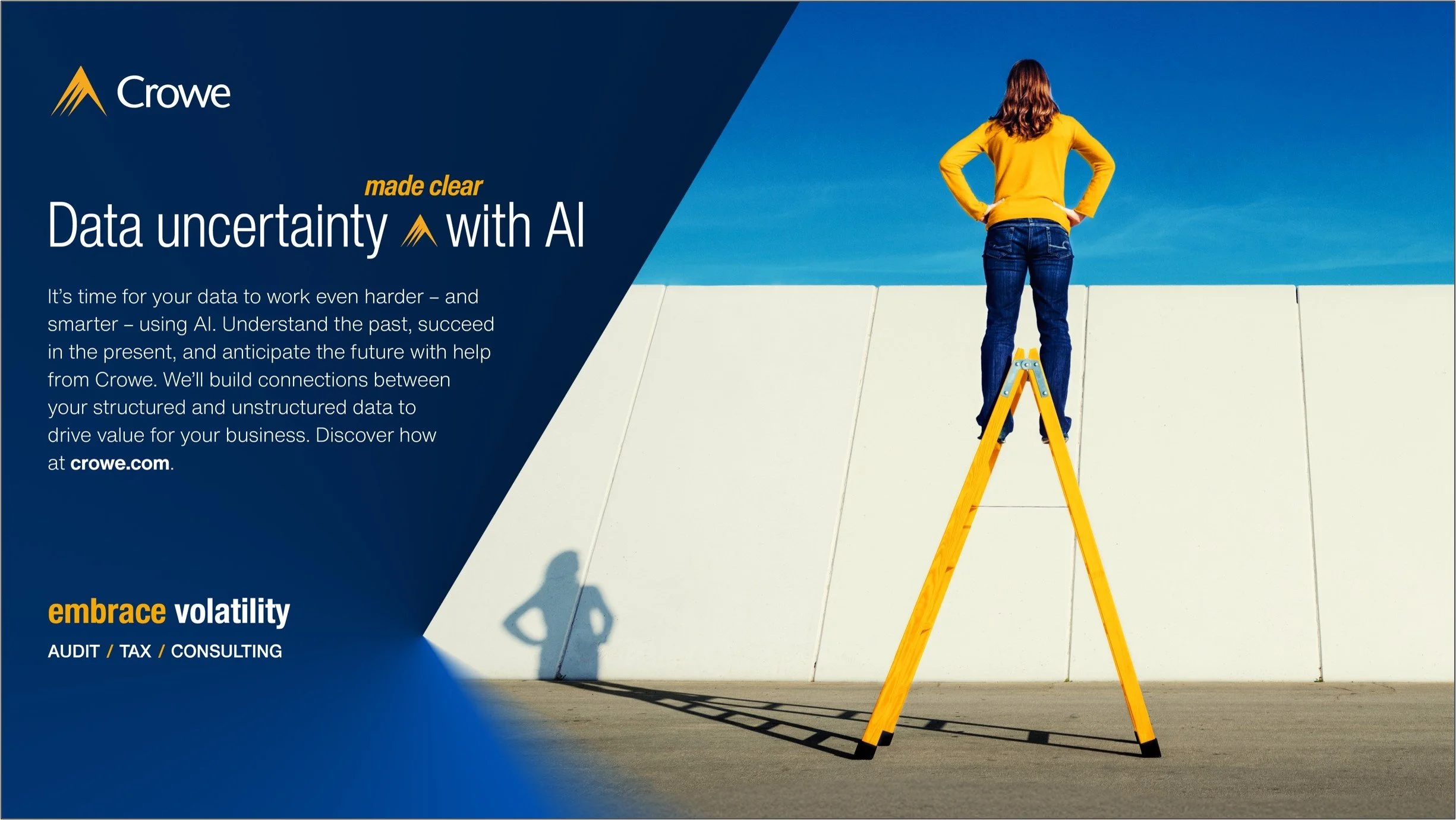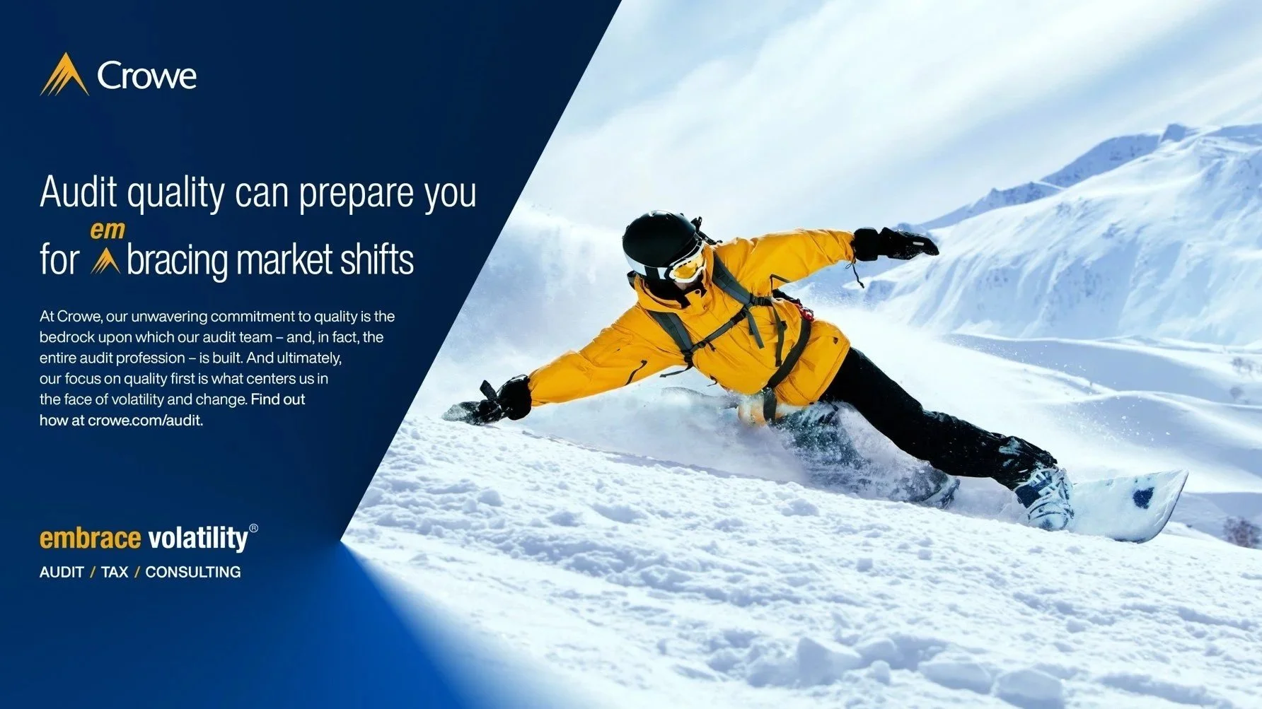 For 80 years, Crowe grew steadily by word of mouth and targeted campaigns - but the refrain we often heard from partners was, “No one knows who we are.” So in 2021, we launched the firm’s first brand campaign, with a focus pulled from the headlines of every business journal: the market is volatile. Crowe focused on the ays it helps bring value to volatility for its client, declaring boldly and with gusto that it’s time for business to do the unthinkable: Embrace Volatility.